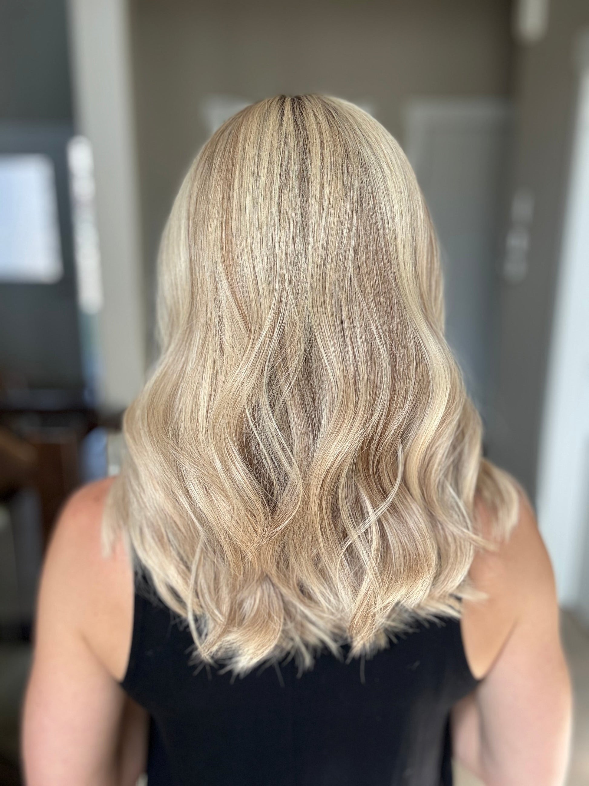 * Color: Warm light/medium dimensional blonde with dark blonde roots.