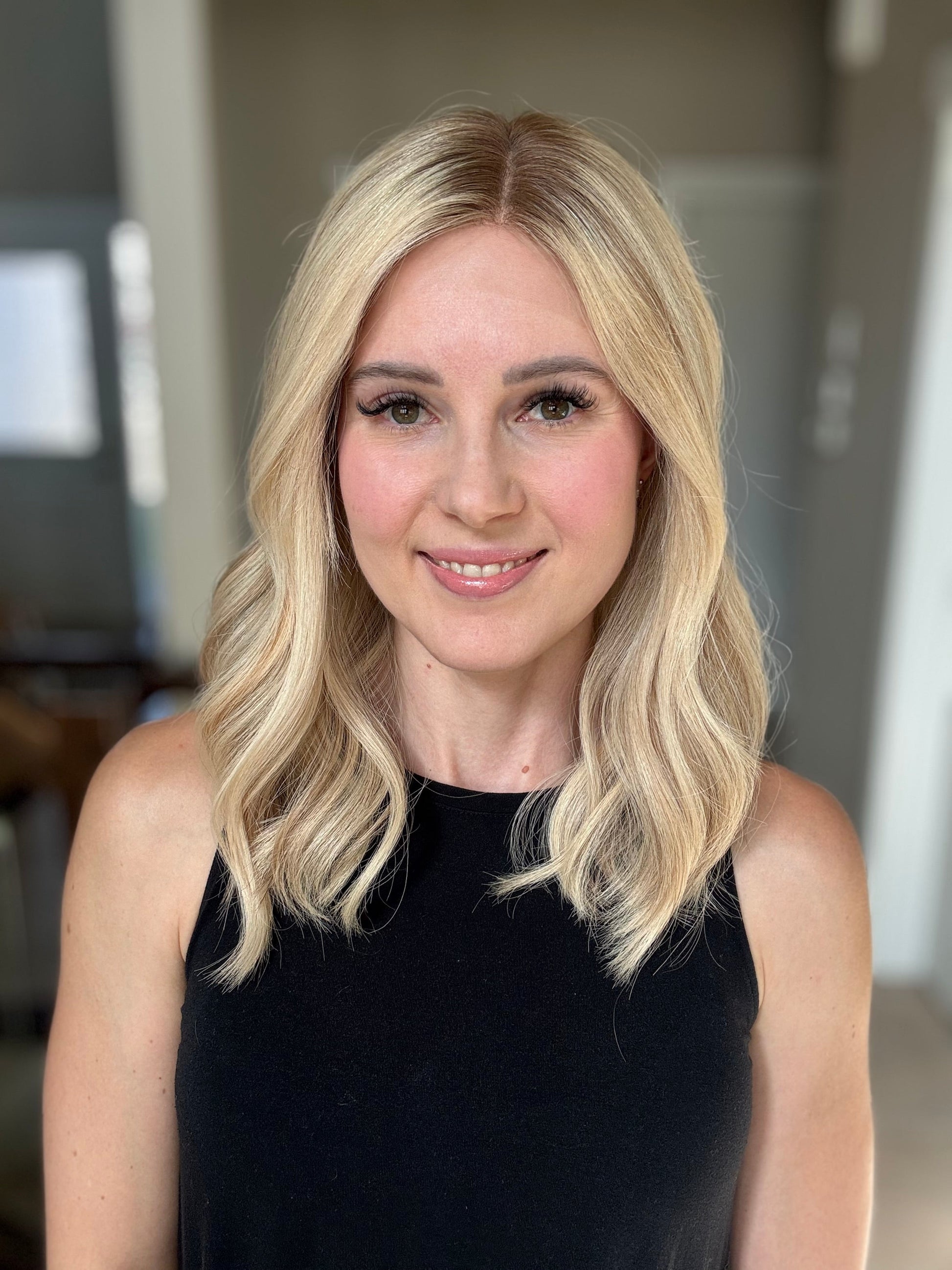 * Color: Warm light/medium dimensional blonde with dark blonde roots.