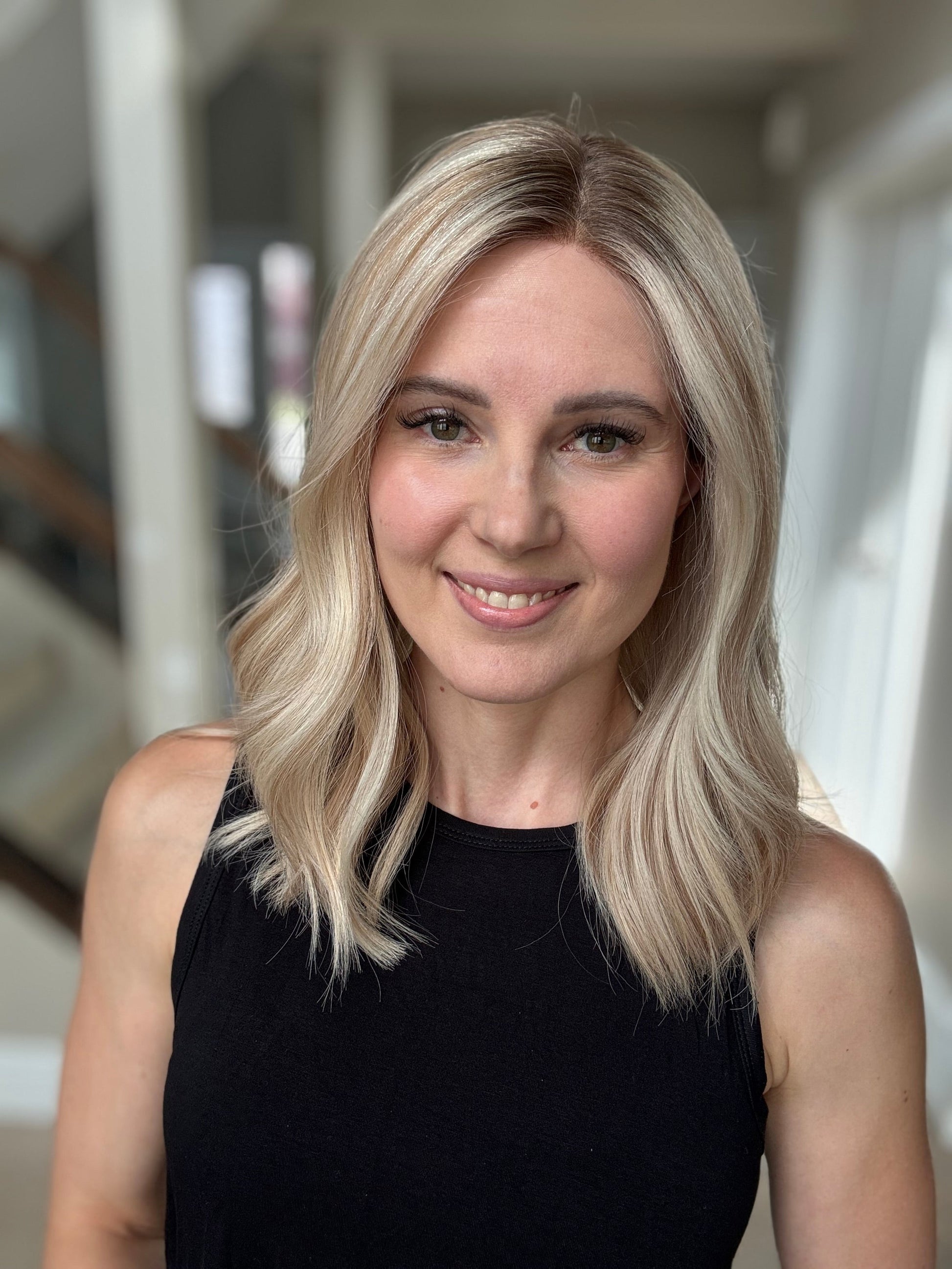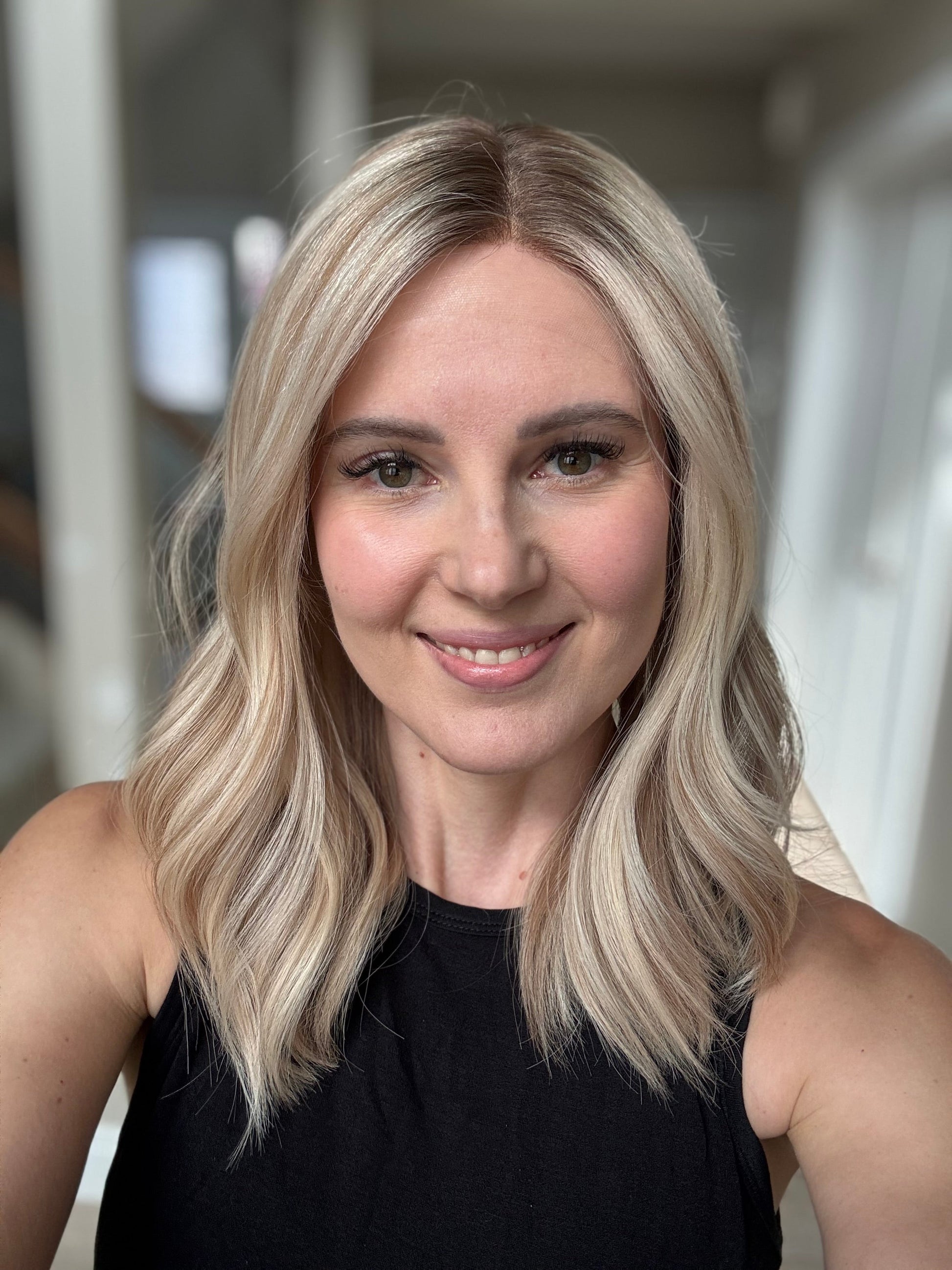 * Color: Light neutral blonde with darker blonde neutral to warm lowlights and a dark blonde root.