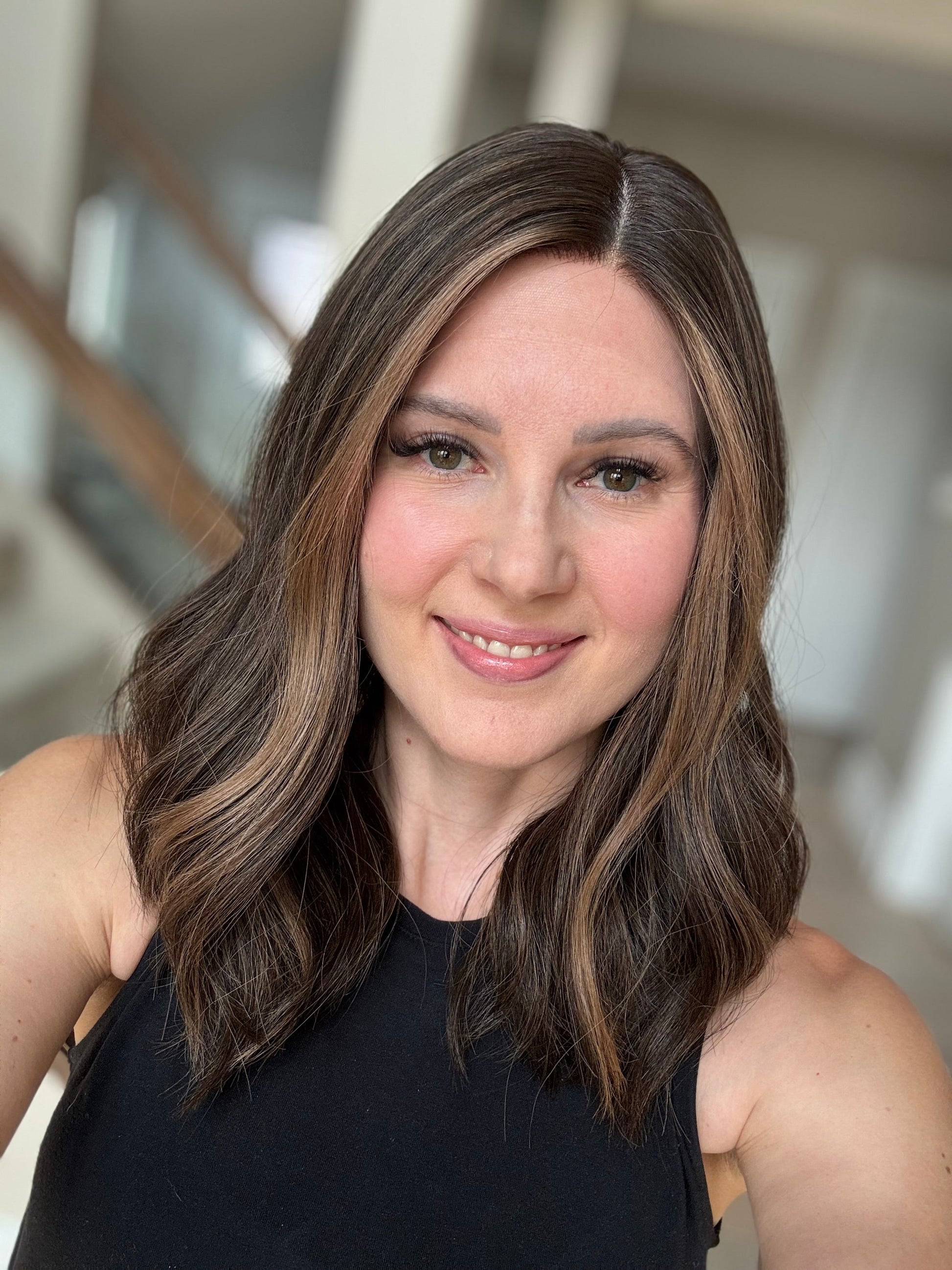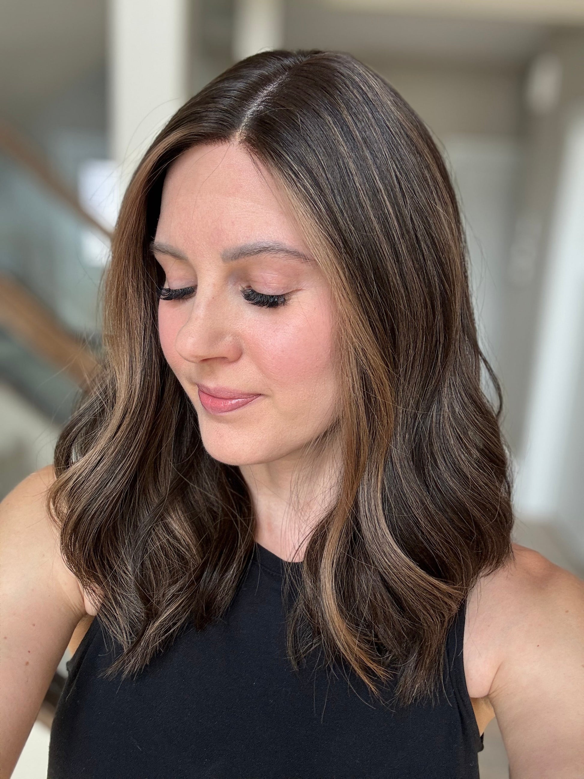 * Color: Darkest brown base with neutral medium brown balayage.
