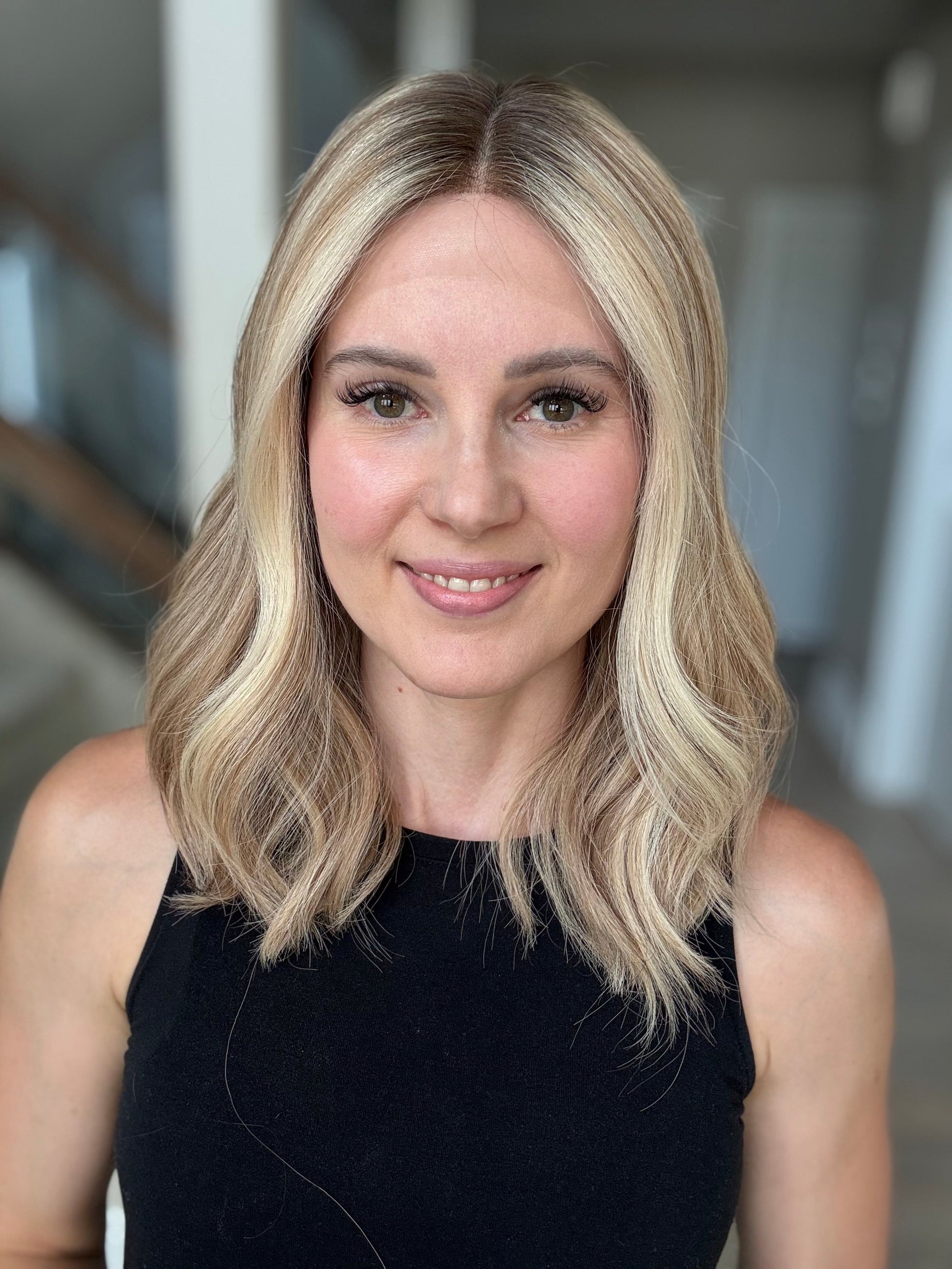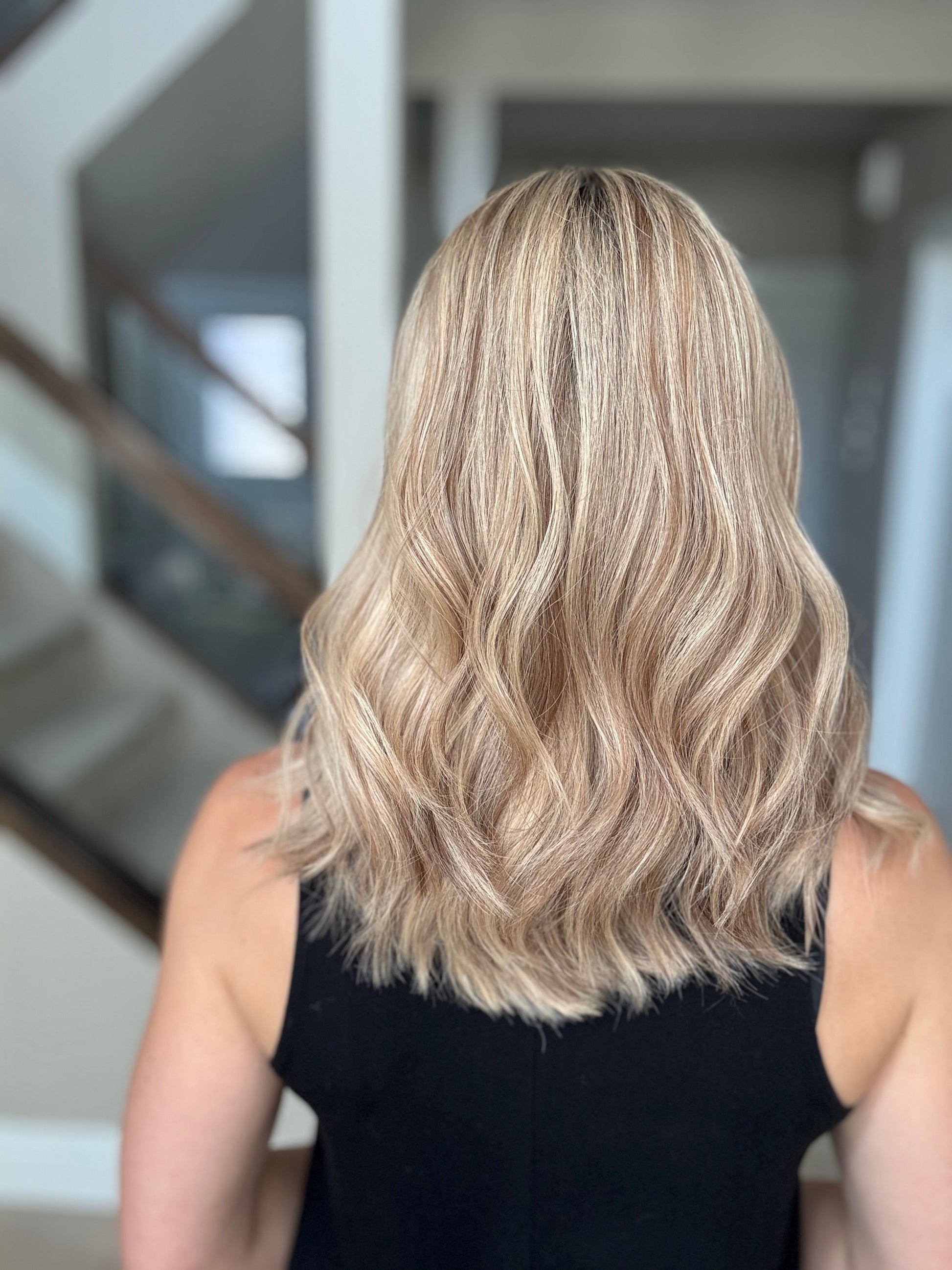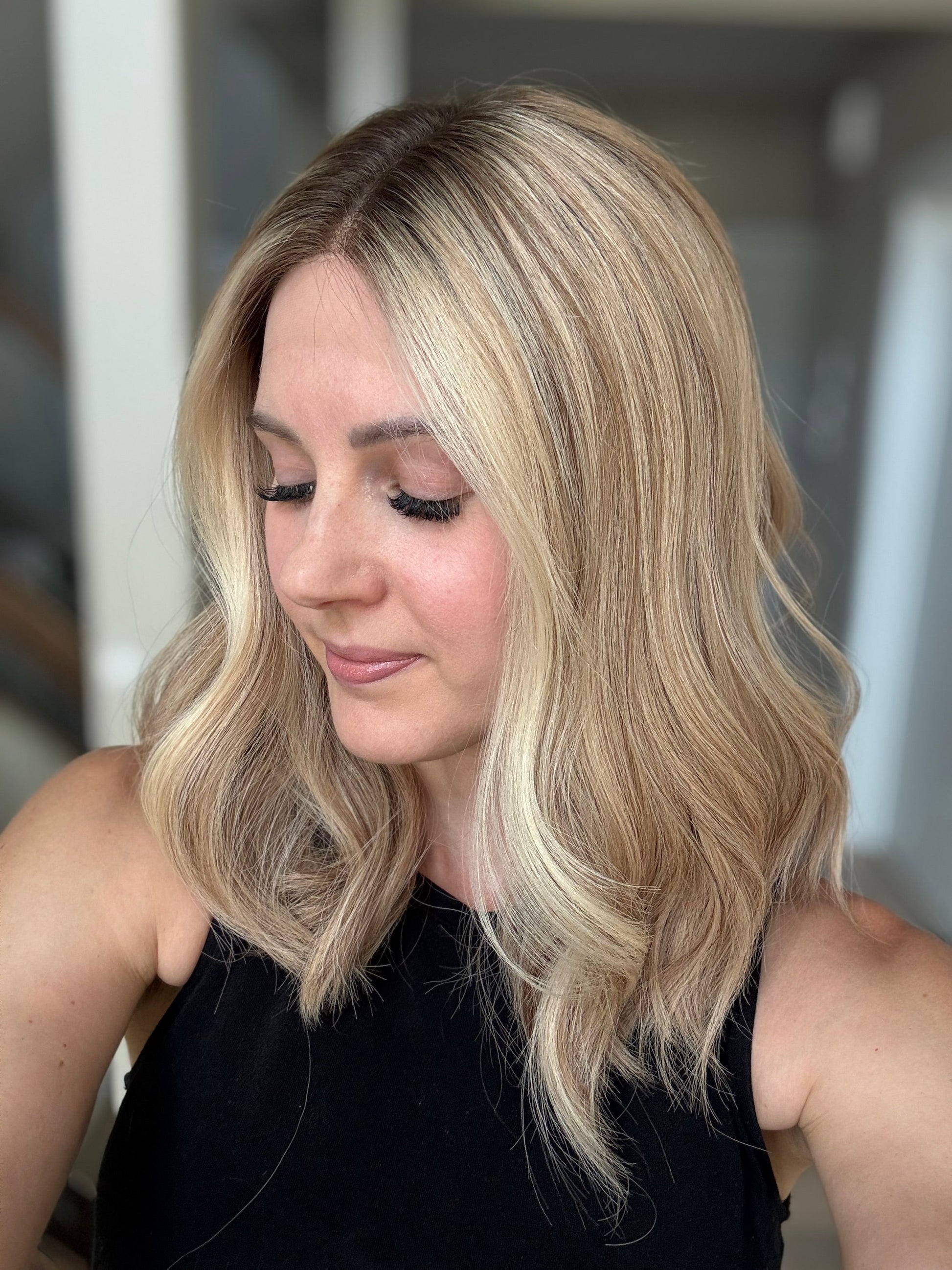 * Color: Dimensional neutral-warm blonde with a medium brown root.