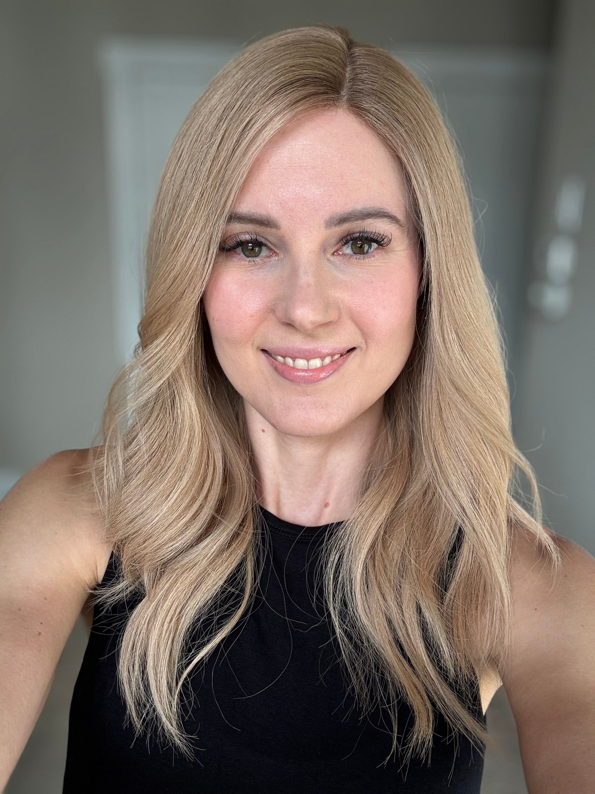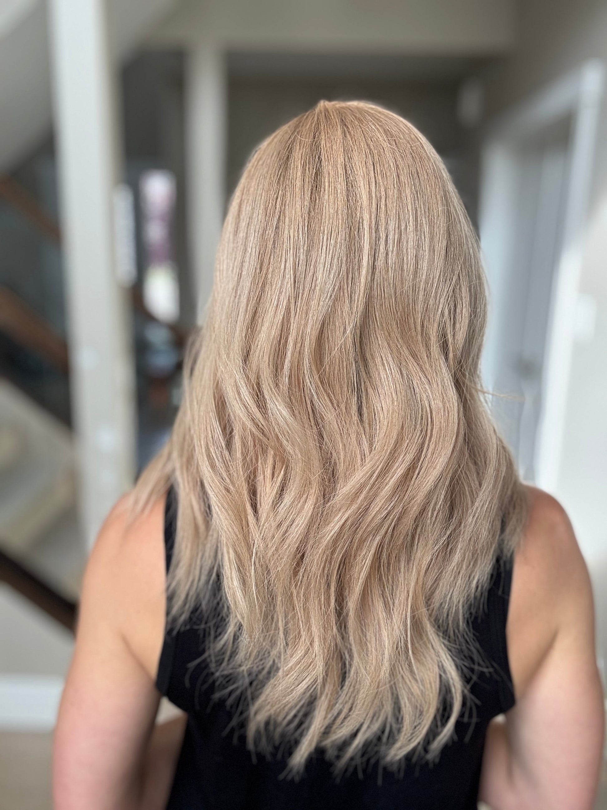 * Color: Medium neutral-warm blonde with a subtle root melt.