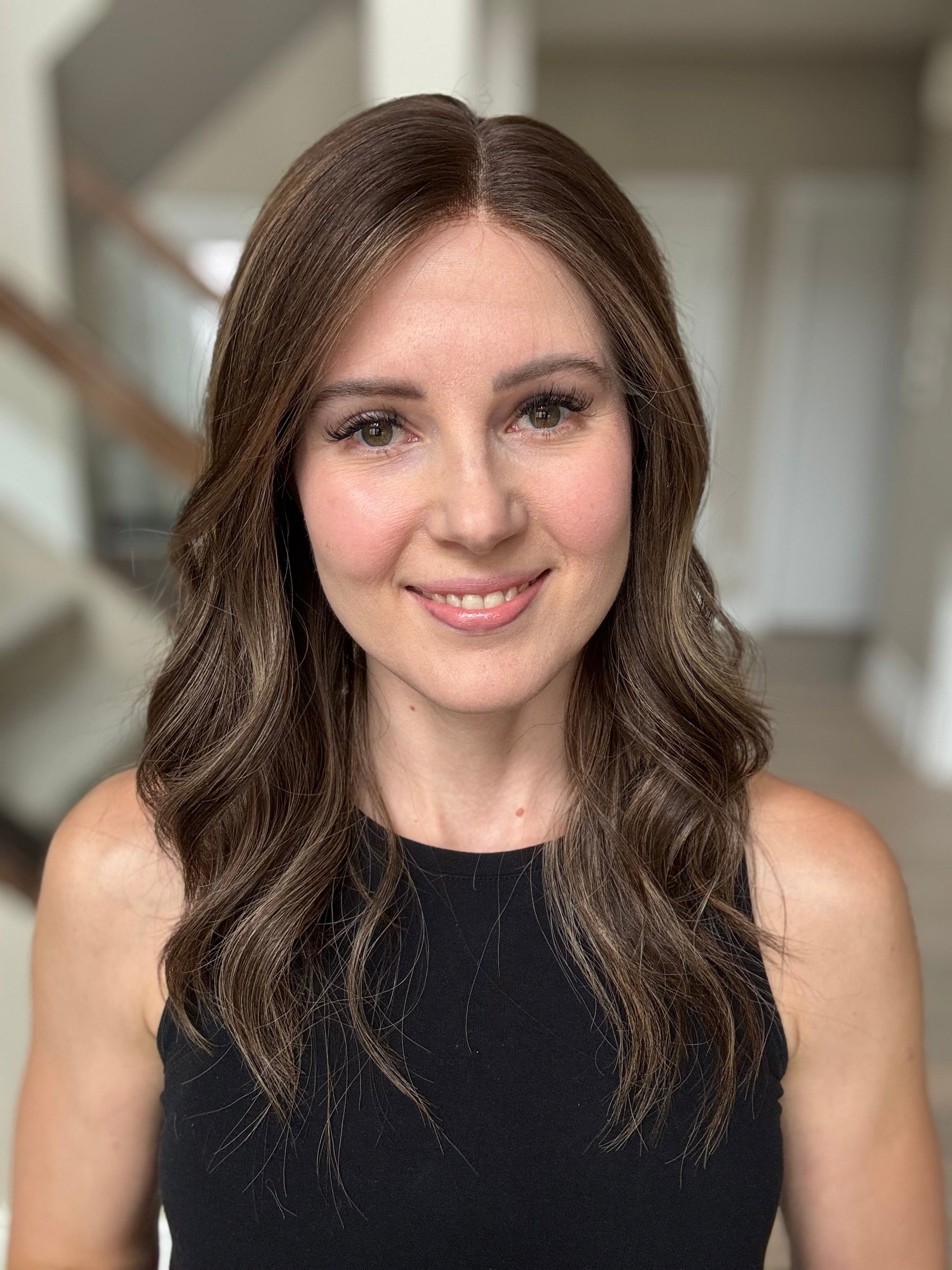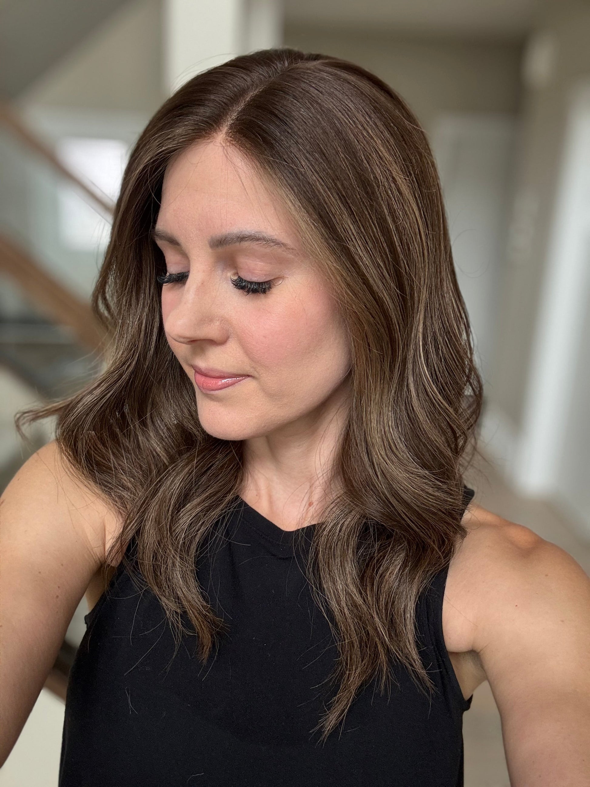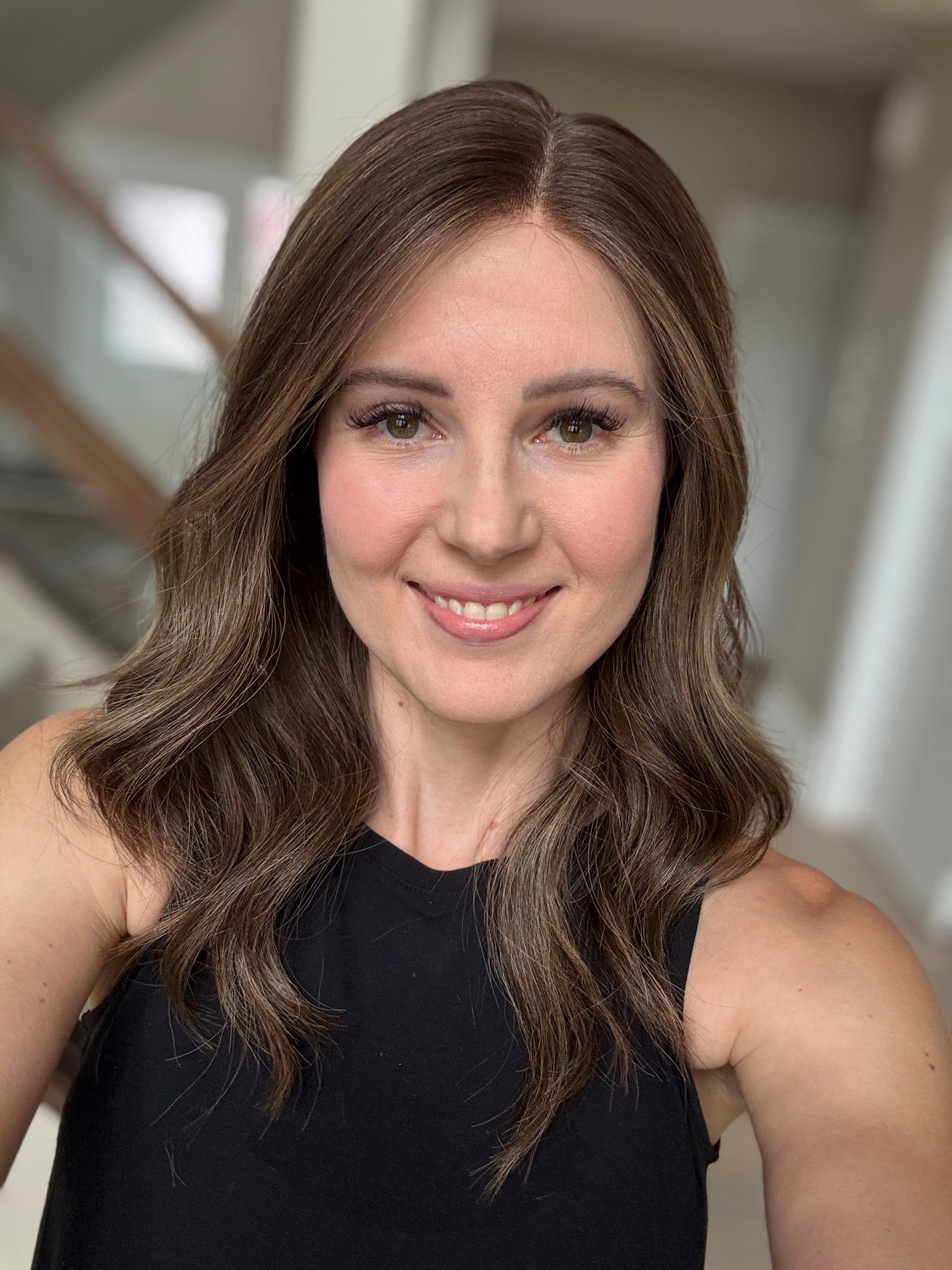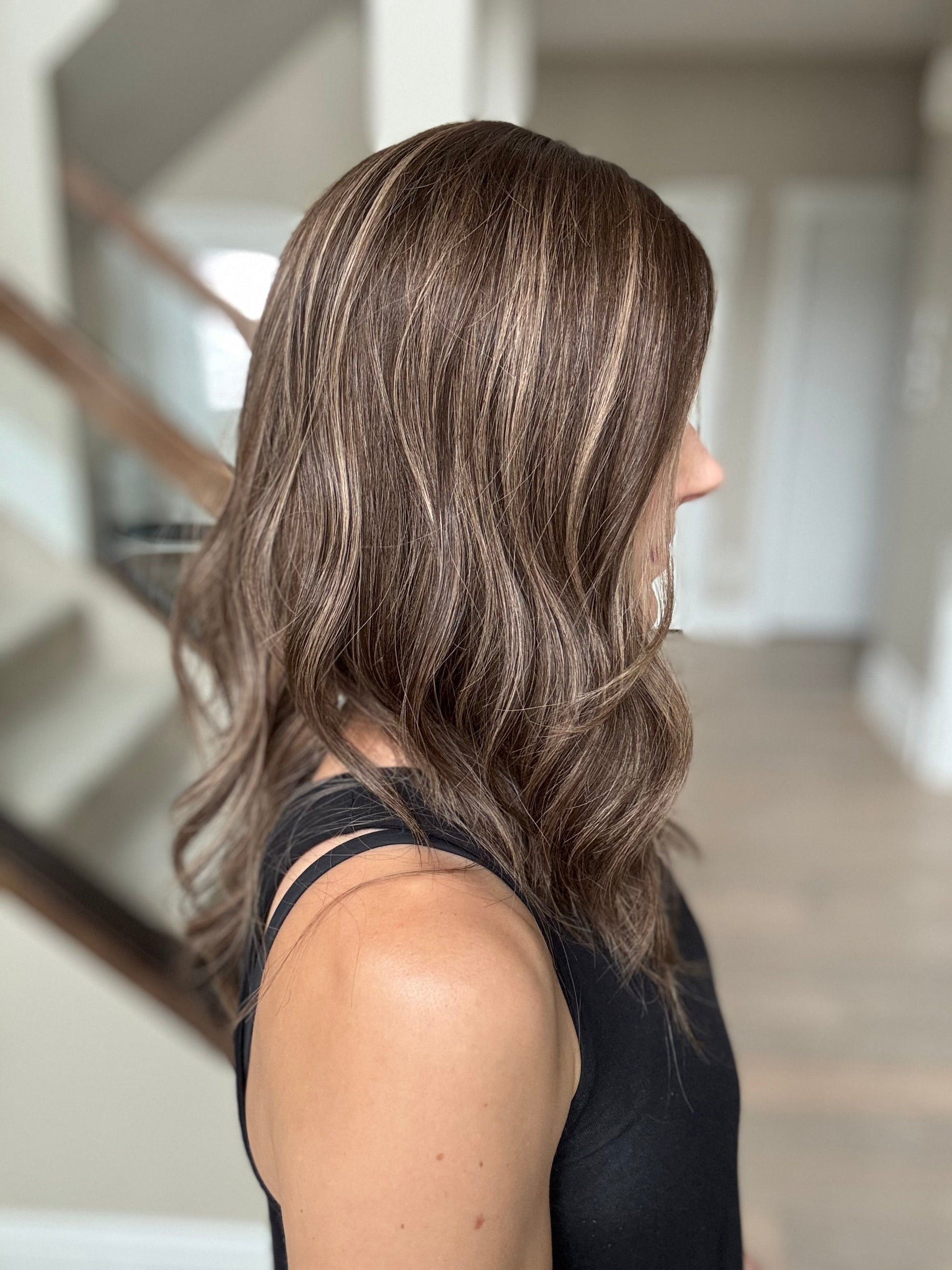 * Color: Dark brown with neutral dark blonde balayage.