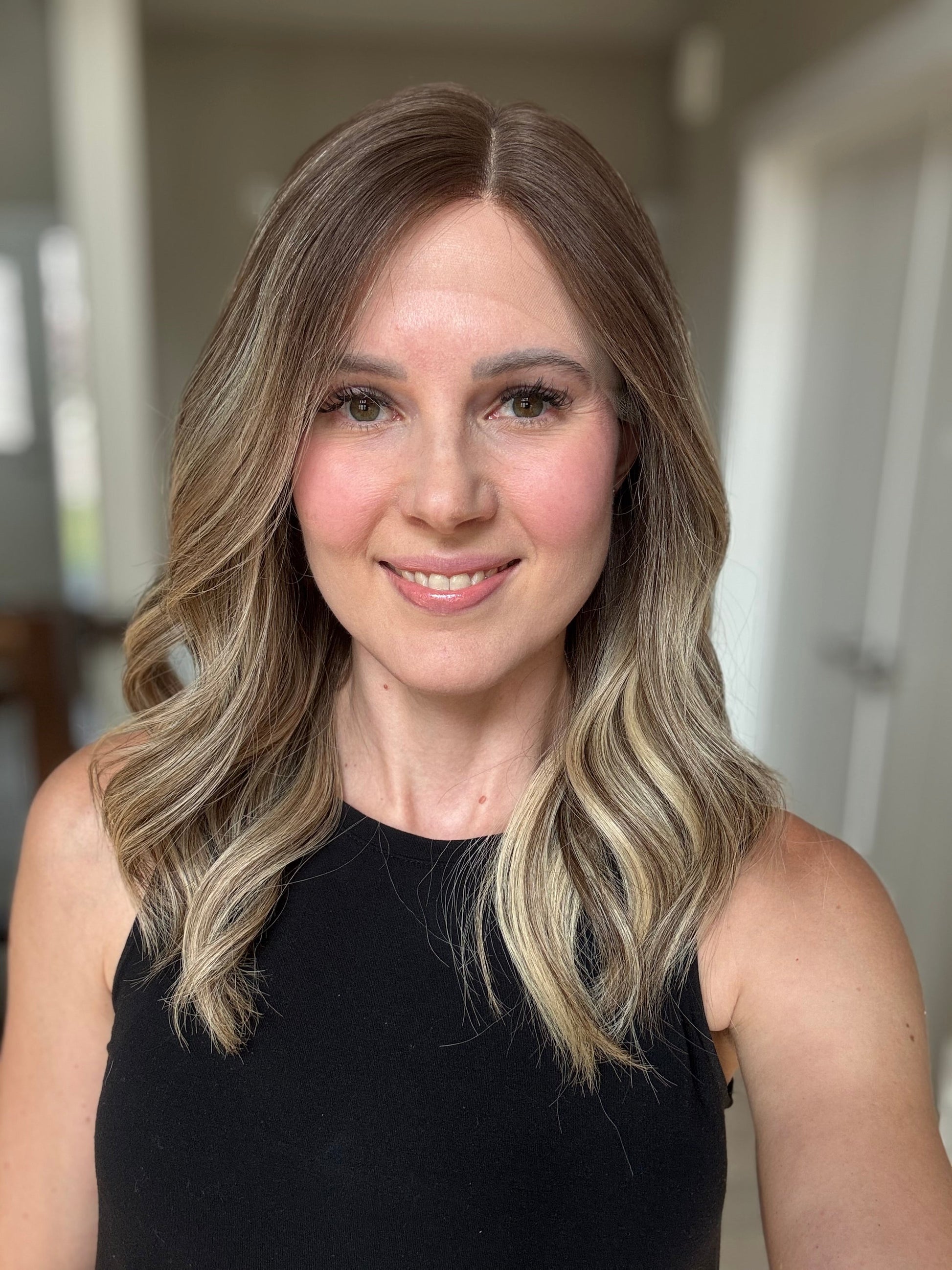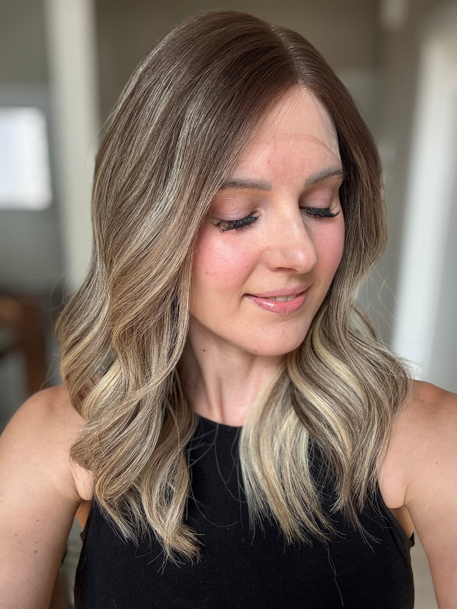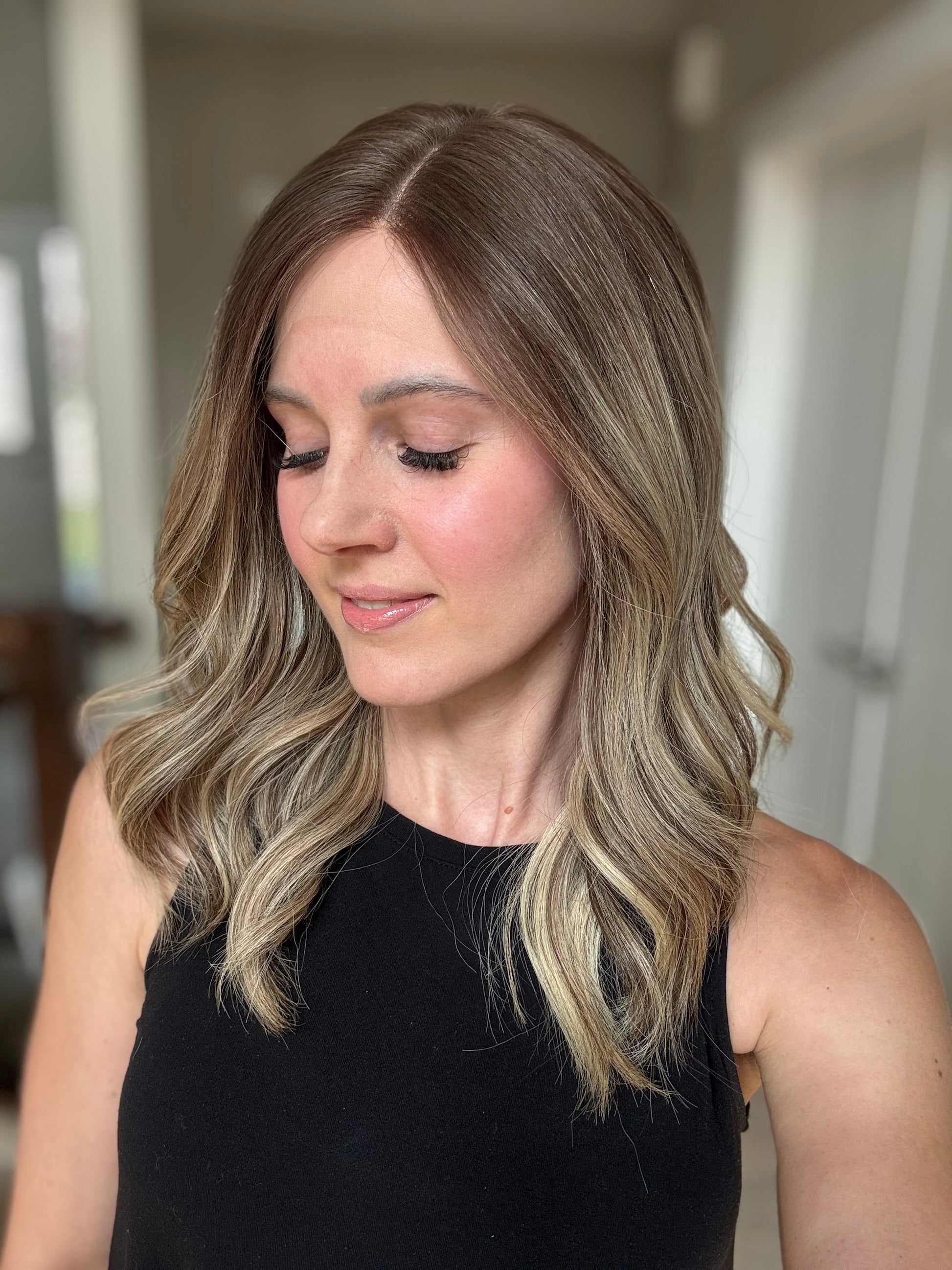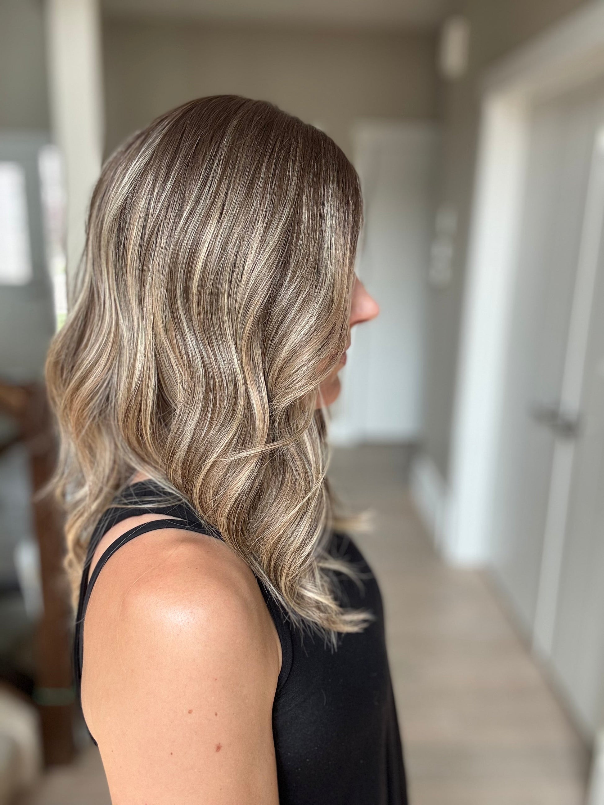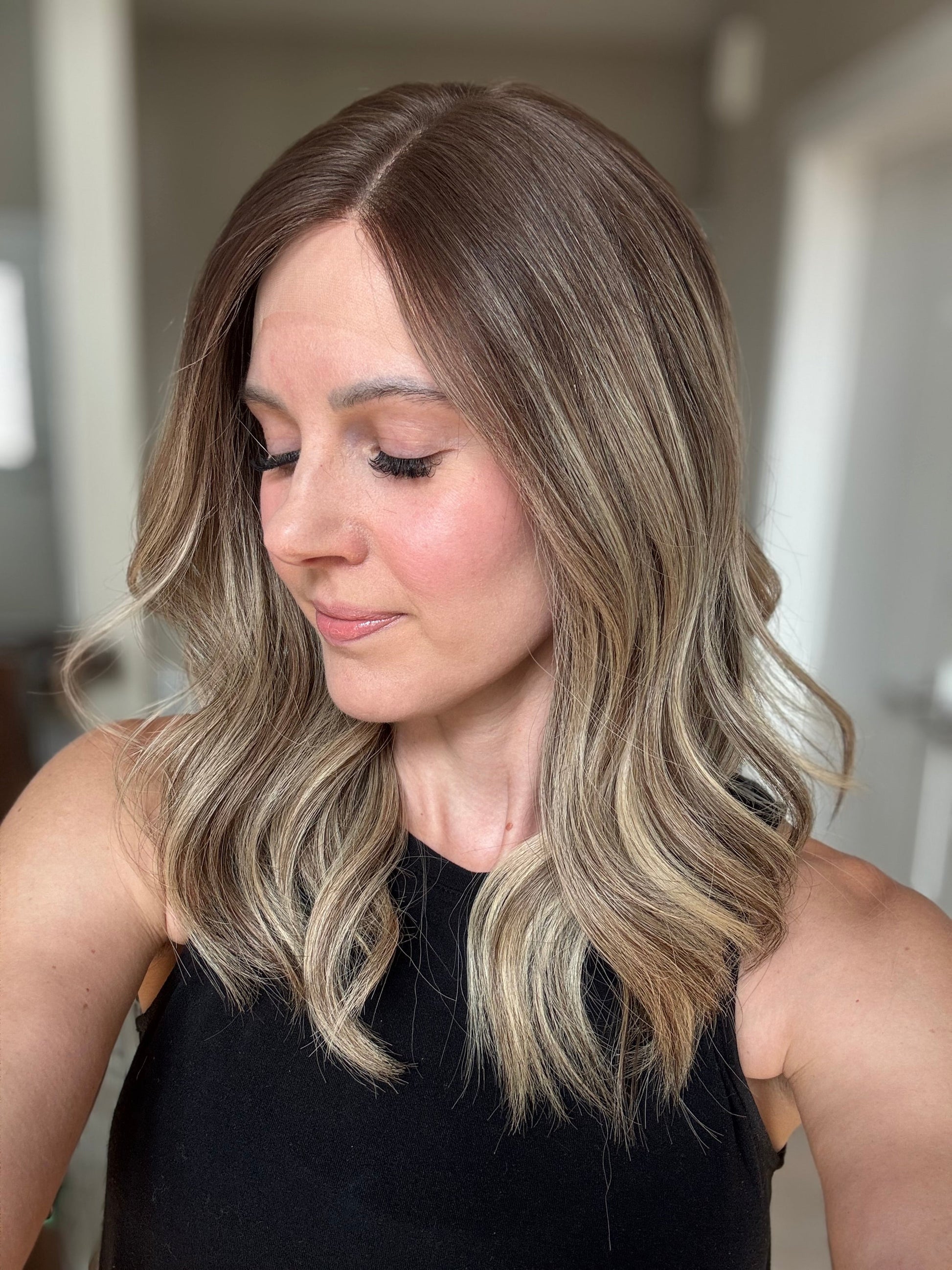 * Color: Neutral light blonde with darker warm blonde dimension on a reverse balayage medium brown root.